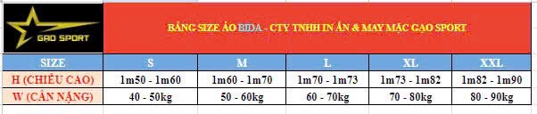 Size áo Bida tại Công ty TNHH In ấn & May mặc Gạo Sport